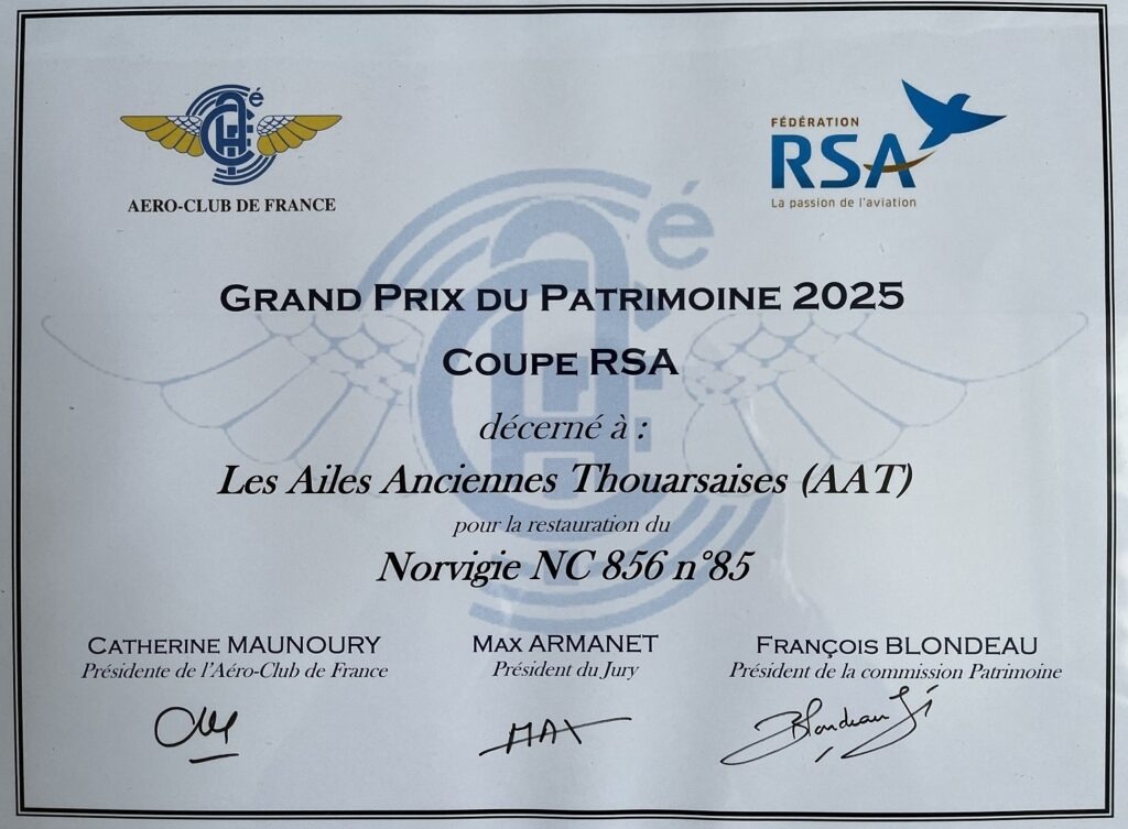 Le 1er décembre 2025, dans les locaux de l’Aéro-Club de France, huit lauréats ont reçu des « coupes » dont celle du RSA décernée aux Ailes Anciennes Thouarsaises puis agrémentée d’un virement bancaire bienvenu…